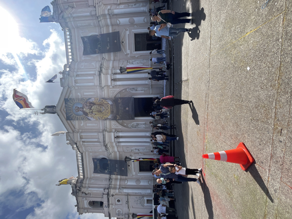 This image presents a forensic view of the Metropolitan Cathedral of Santiago de Guatemala in Guatemala City, Guatemala, under bright daylight with a partly cloudy sky. The cathedral's ornate, light-colored neo-classical facade is prominent, featuring multiple columns, arched entrances, and statuary on its roofline, including a golden figure on the left tower and a figure holding a cross centrally. Large banners adorn the facade: a central banner depicts a crowned Virgin Mary figure, flanked by two darker banners displaying "1750-2025" and "30 años 1995-2025." Religious flags, including one with yellow, red, and blue horizontal stripes, fly from the cathedral's roof. A sizable crowd of individuals, including adults and children, occupies the paved forecourt and the cathedral steps. People are dressed in casual attire, moving, standing, and congregating; some are observed entering or exiting the cathedral's main doorways. White, confetti-like debris is scattered across the pavement near the cathedral's base. In the lower-left foreground, an orange traffic cone with a white reflective stripe stands upright, casting a distinct shadow to its left on the gray pavement. Visible individuals include a woman holding a baby alongside a young girl on the left, a woman walking away from the viewer towards the cathedral in the center, and a man and woman conversing on the right. Strong shadows are cast across the ground, indicating direct sunlight.