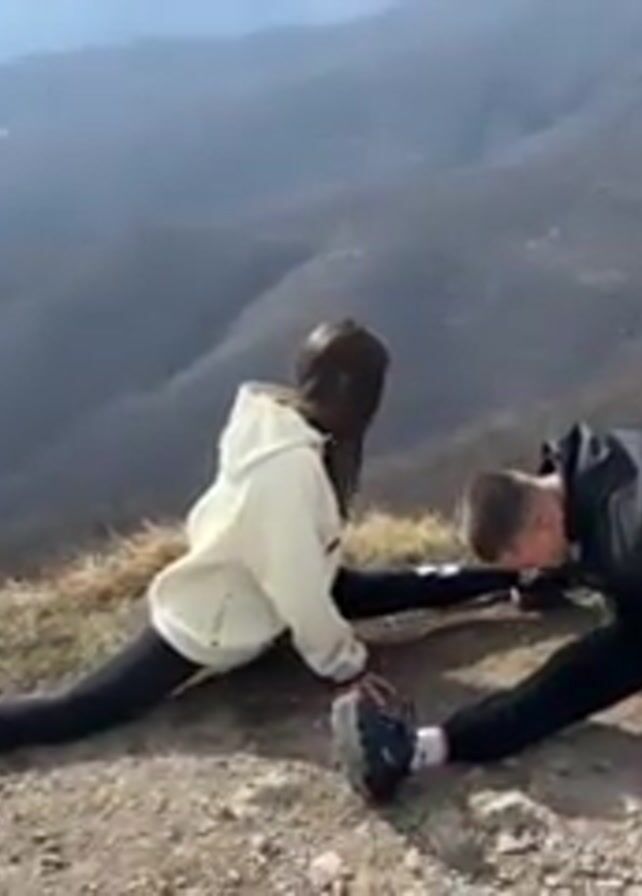 A woman and a man, dressed in casual athletic clothing, are doing a splits pose on a rocky, grassy cliff overlooking a mountainous landscape