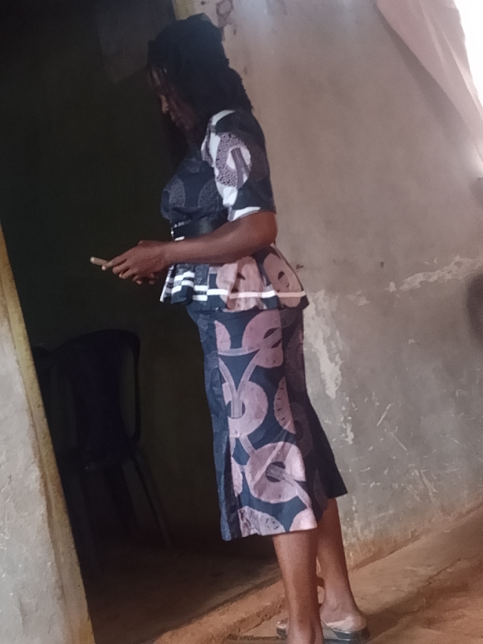 The image captures a female individual standing in profile, facing left, within an indoor environment in the city of Unknown, Unknown. The subject has dark skin and dark hair. She is attired in a short-sleeved peplum top and a long skirt, both featuring a dark blue/black base with abstract patterns in white and pink/mauve. A black belt cinches her waist. She wears light-colored open-toed footwear. Her hands are engaged with a light-colored mobile phone, which she holds horizontally while looking down at its screen. To her immediate left, a dark chair is partially visible against a dark background, possibly a doorway or unlit recess. To her right, a rough, light grey wall displays texture and marks. The floor appears to be uneven, light brown earth or concrete. Light enters the scene from the right, illuminating the subject and the adjacent wall.