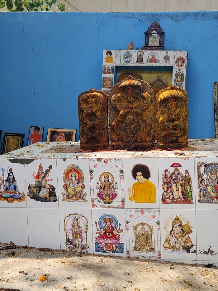 The image depicts an outdoor Hindu shrine or altar situated against a vibrant blue-painted wall in Pedda Kammavaripalli, India