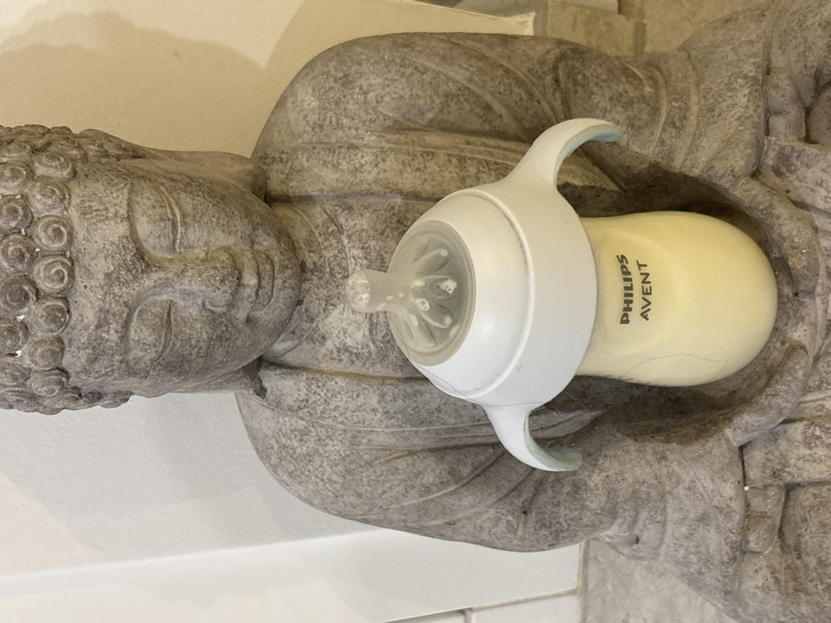 An indoor, eye-level photograph depicts a weathered, grey-brown stone Buddha statue positioned centrally. The statue's cupped hands support a light yellow Philips Avent baby bottle, filled with an opaque, pale yellow liquid. The bottle components include a white plastic body, a white handled ring, and a translucent silicone spout displaying small internal air bubbles. The Buddha statue features closed eyes and detailed carving on its head and robes. The background is a plain, light-colored wall. This scene is located in Junglinster, Luxembourg.