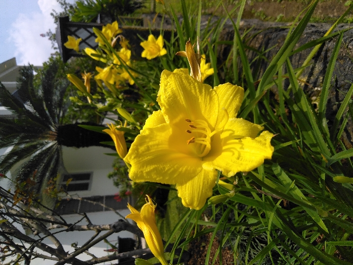 The image depicts an outdoor garden scene, likely a residential property, under bright sunlight in Emmerich on the Rhine, Germany. The primary subject is a vibrant yellow daylily (Hemerocallis) blossom positioned prominently in the foreground and in sharp focus. Its six petals are fully extended, revealing the yellow stamen and pistil at its center. Surrounding the central daylily are numerous green, blade-like leaves belonging to the plant, with further yellow daylily blossoms and buds visible in the blurred midground. A dark, low retaining wall or planter border runs diagonally along the lower right side of the frame. In the midground-right, a dark-colored, ornate garden lamp with a lantern-style head is visible. To the left and center-midground, a large, dark-trunked tree with green, palm-like fronds (resembling a Sago palm or similar cycad) stands. Behind this tree and to the left, a segment of a white building with at least one visible window is present, out of focus. The sky in the upper right quadrant is blue with minimal white cloud cover. No individuals are present in the scene. The overall lighting suggests a clear, sunny day, casting distinct shadows.