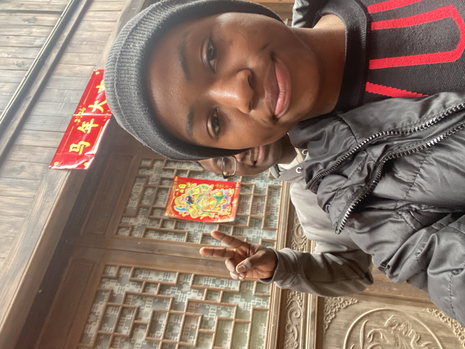 Two individuals pose for a selfie in front of a wooden door adorned with decorative panels. One person, wearing a black beanie, smiles at the camera. Behind them, another person in glasses also smiles, holding up a peace sign. Two red paper decorations with gold lettering are visible on the door, one above and one slightly below. The first person is wearing a black sweater with red detailing and a black jacket.