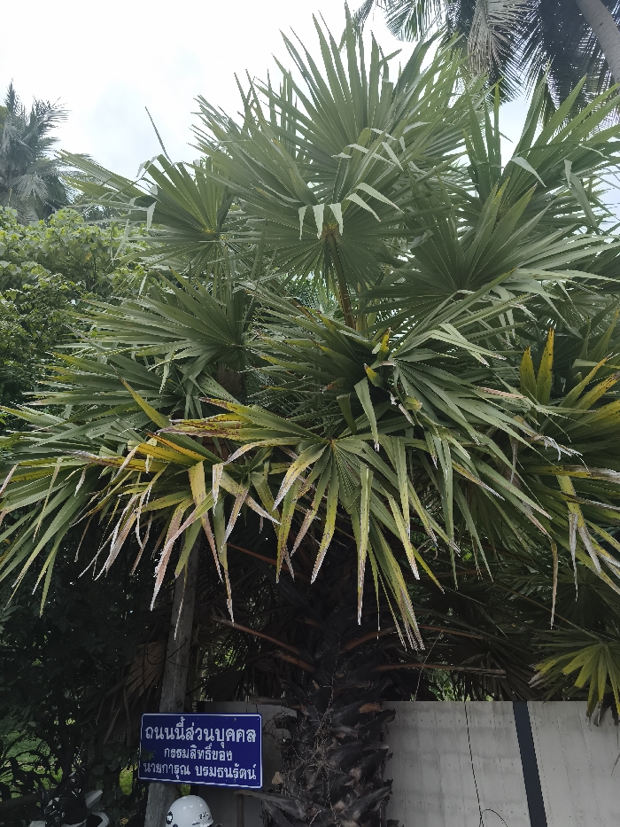 A large palm tree with many fronds dominates the frame. The leaves are mostly green, with some showing yellowing and browning tips. Below the palm, a blue sign written in Thai is visible, along with what appears to be a motorcycle helmet and other vegetation. A grey concrete wall serves as a backdrop.