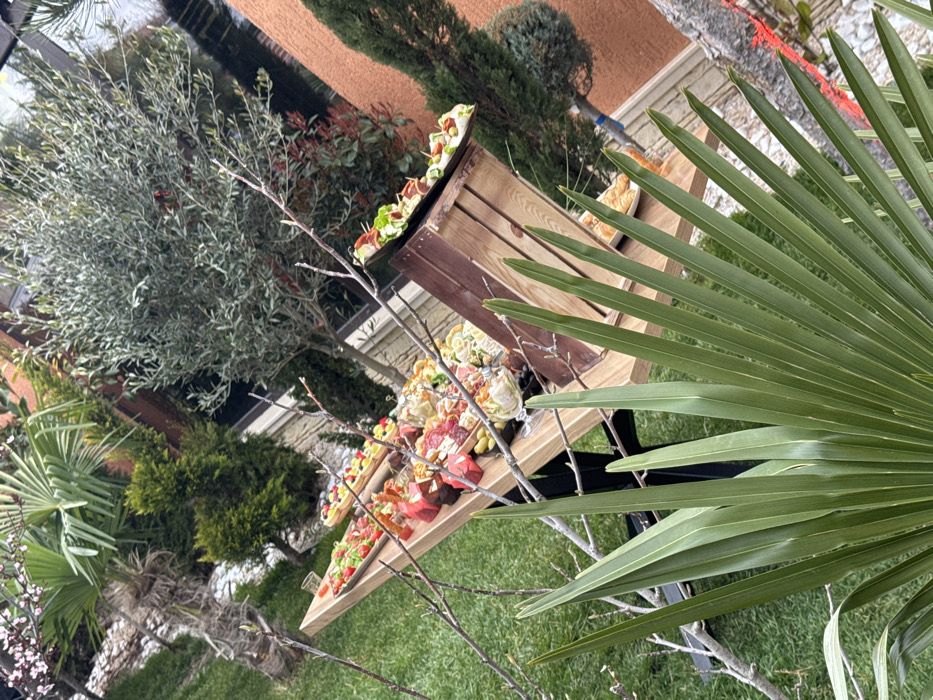 This image captures an outdoor catering display within a landscaped garden in Belozem, Bulgaria