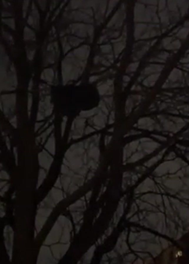 silhouetted tree with bare branches against a dark, overcast sky. A dark, roughly rectangular object is lodged in the upper branches of the tree. The lower portion of an apartment building is visible in the background, with lights on in some windows.