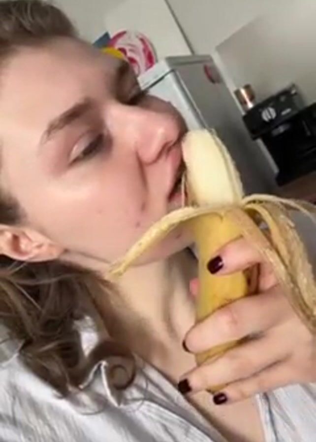 A fair-skinned woman with wavy brown hair partially up in a white headband, and wearing a light blue striped button-down shirt, is eating a banana. Her fingernails are painted a dark color. She bites into the banana, then looks directly at the camera. A white refrigerator, a coffee maker, and artwork are visible in the background.
