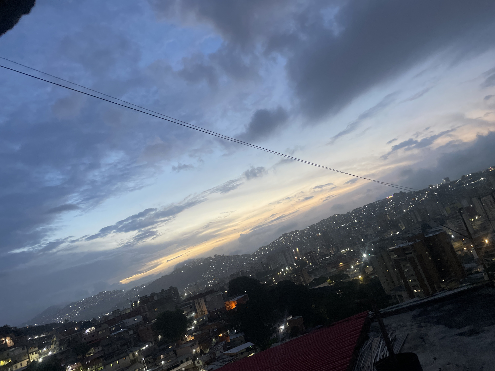 The image captures a cityscape in Caracas, Venezuela, at dusk or dawn. The sky is filled with clouds, transitioning from dark gray to lighter shades of blue and orange near the horizon. Below, the city extends across a mountainous terrain, with numerous buildings illuminated by lights. In the foreground, a rooftop with a red section is visible. Two power lines are stretched across the sky in the upper part of the frame.