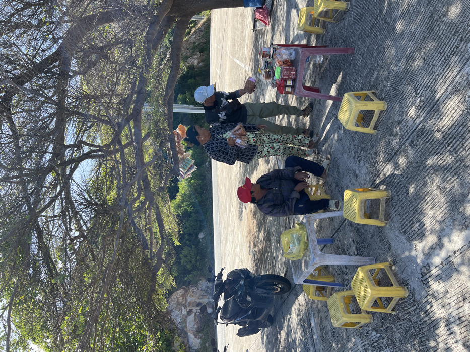 A small market scene unfolds outdoors. Three people stand and sit around a red table stocked with goods, seemingly purchasing items. Yellow plastic stools are scattered nearby. A dark motorcycle is parked on the pavement. Above, a tree with many branches stretches across the scene, casting shadows, while a cliffside with greenery rises in the background. The setting appears to be a roadside stop or rest area.