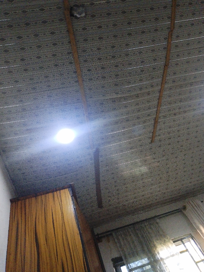 The scene depicts an upward-angled view of an indoor ceiling and upper room elements, situated in Unknown, Unknown. The ceiling is constructed from light gray patterned panels featuring a repetitive design of dark diamonds and horizontal lines, with multiple longitudinal wooden slats spanning its length. A circular, bright white light fixture is mounted on the ceiling, emitting a strong glare. In the upper left corner, an irregular gray mass, consistent with a small nest or debris, is affixed to the ceiling. On the left side of the frame, the upper section of a tall, dark brown cabinet or wardrobe with a prominent vertical wood grain is visible against a plain white wall. To the right, a window, partially obscured by sheer, light-colored curtains, allows natural light into the room. A dark curtain rod is positioned horizontally above the window. No individuals are present, and no actions or interactions are depicted.