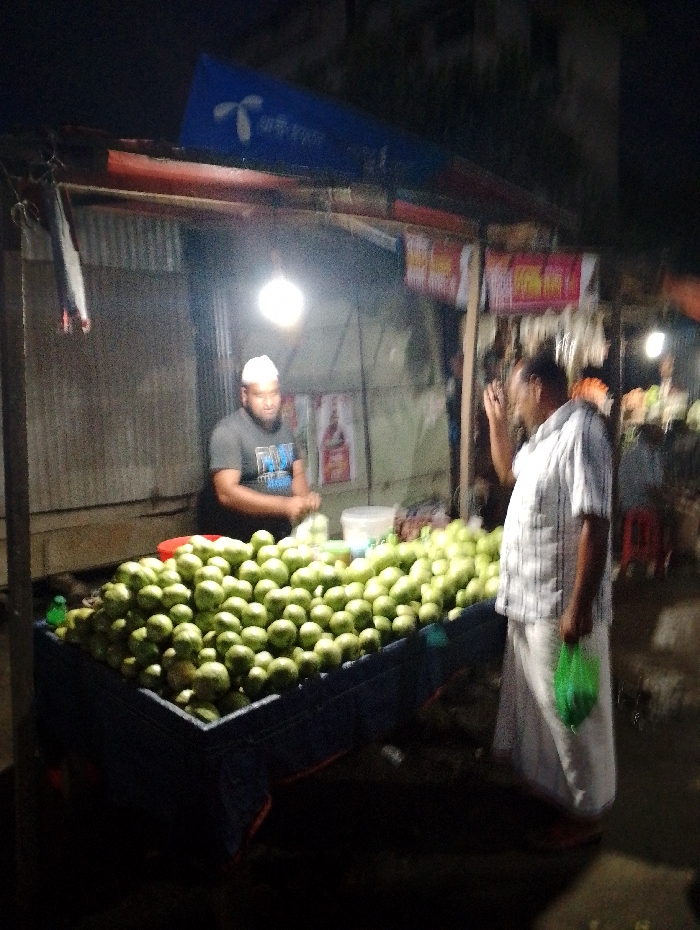 street vendor selling green fruit, likely mangoes, from a cart under a blue awning. Two men are present: one is standing behind the cart, wearing a blue shirt and a white cap, while the other man, wearing a white shirt and white pants, appears to be a customer. The scene is dimly lit, illuminated by a single overhead lamp. The fruit is piled high in the cart, and a red plastic bucket is visible in the background. The location is a street in Bhola, Bangladesh, specifically at the coordinates 22.657 latitude, 90.663 longitude. The scene appears to be at night, judging by the shadows and the dark background. The fruit appears fresh and is likely being sold to passersby.