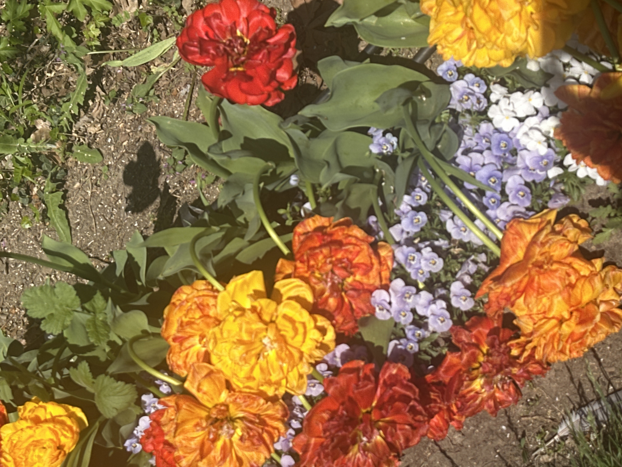 close-up view of a flowerbed. The flowerbed contains a variety of colorful flowers, including red, yellow, orange, white, and light purple. The flowers appear to be tulips and pansies. The background is dirt and some green vegetation. The image was likely taken outdoors during the day. There is no information indicating this image was taken in Varna, Bulgaria.