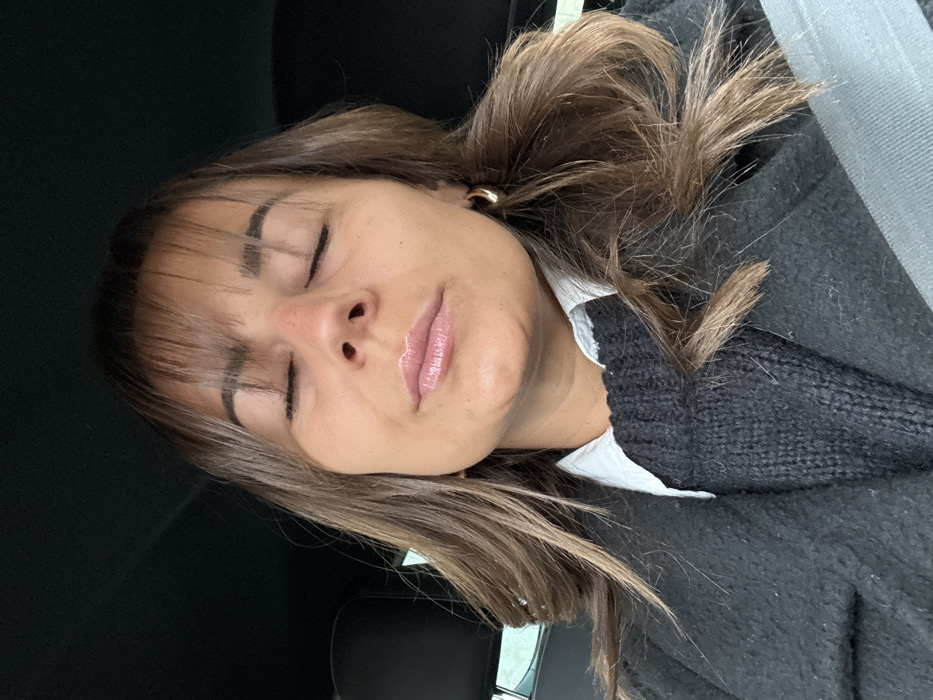 The image displays a close-up portrait of an adult female seated in what appears to be the passenger seat of a vehicle. Her eyes are closed, and her facial expression is neutral. She has light brown hair styled with bangs across her forehead, and her lips appear glossy. A gold-toned hoop earring is visible on her right earlobe. She is dressed in a white collared shirt layered under a dark, possibly black, knitted sweater, over which a dark, textured overcoat is worn. A light grey vehicle seatbelt is positioned diagonally across her chest, from her left shoulder downwards. The vehicle's interior features a dark headliner and a dark seat visible behind her on the left. A blurred, light-toned background suggesting an outdoor environment is visible through a window on the left side of the frame. The specific location within the city of Veauche, France, cannot be determined from the provided image.
