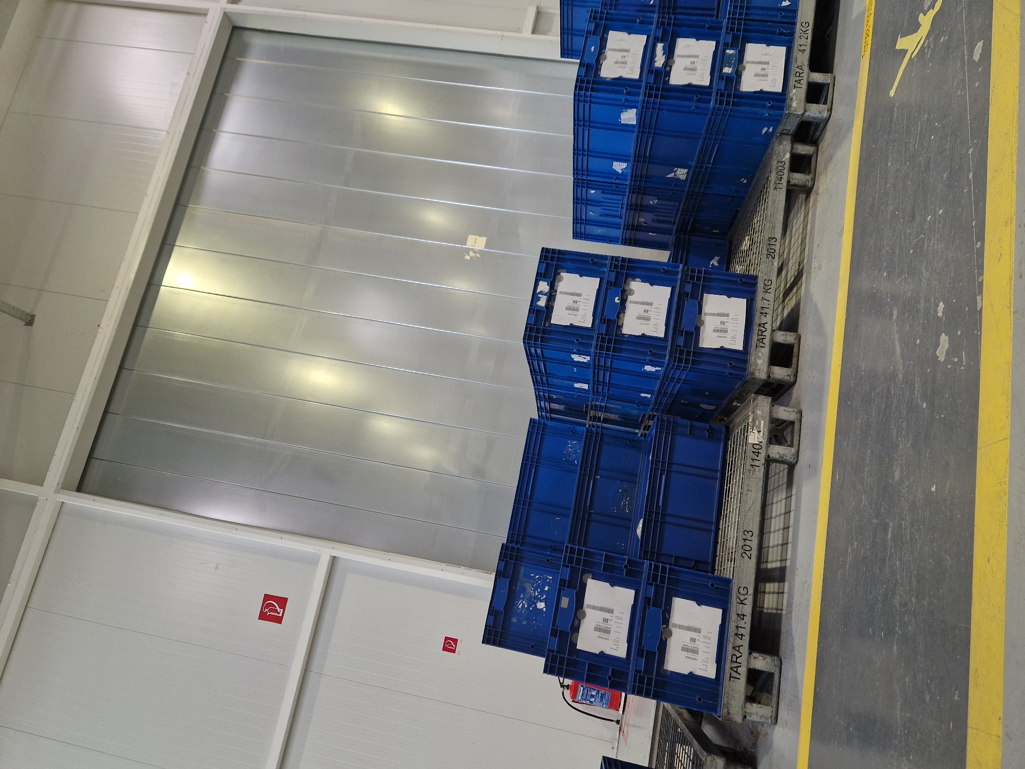 interior of a warehouse. Stacks of blue plastic crates on metal pallets are aligned next to a gray floor with yellow safety lines. The warehouse walls are made of metal panels. A fire extinguisher is mounted on the wall near the base of a stack of crates. A red fire safety sign is also present on the wall. The location is implied as Bahovitsa, Bulgaria, based on the prompt. There are no people in the image.