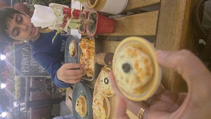 A young boy in a blue sweatshirt sits at a wooden table enjoying a meal. The table is set with small quiches or tarts, one of which is held up in a yellow cup, showing a topping of melted cheese and a black olive. A container of pasta and a small potted plant sit nearby. Behind the boy is a sign that reads "PLANT A PARTY WITH...." There are flowers on a wall behind the sign.