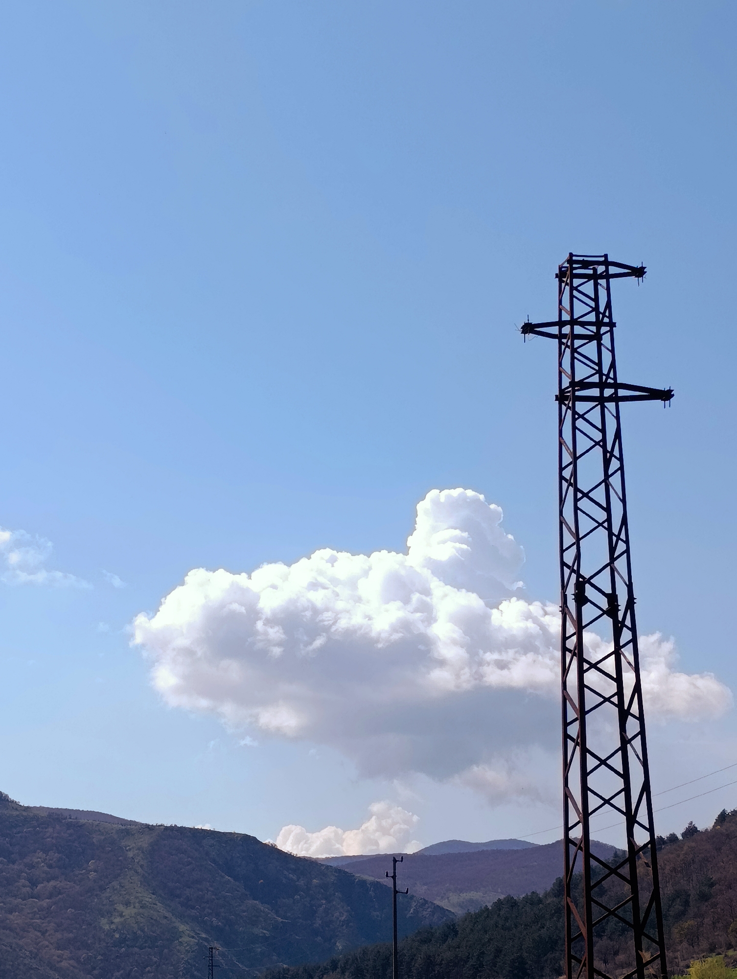n electrical transmission tower in a mountainous region near Shiroko pole, Bulgaria. The tower is made of dark metal latticework and stands tall against a light blue sky dotted with fluffy white clouds. In the background, rolling hills covered with trees are visible. Powerlines extend from the tower.