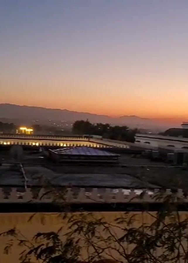 The video captures an elevated view of a cityscape at dawn or dusk. The sky transitions from a deep blue at the top to a vibrant orange near the horizon where silhouettes of mountains are visible. Several buildings are visible, most of which are white or light-colored with distinct architectural details and rooflines. Some buildings have lights illuminating them. A foreground wall with a decorative top runs along the bottom of the frame. Sparse foliage partially obscures the lower portion of the wall. The camera remains static throughout the short video.