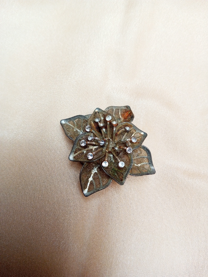 An overhead close-up image depicts a tarnished metallic floral brooch resting on a light beige satin-like fabric surface