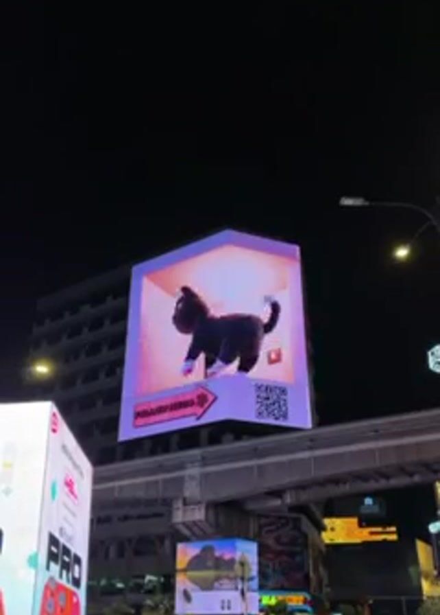 busy outdoor street scene at night. In the foreground are several people walking, standing, and interacting with each other. Above the crowd are large digital billboards. The most prominent one displays an animation of a black cat moving and turning its head. This billboard has a distinctive house shape, suggesting it's an ad for a pet product. Other billboards are visible, including one advertising a phone, and a smaller one with a landscape image. An elevated railway track is above the billboards. Streetlights are visible, illuminating the area. The overall atmosphere is bustling and urban.