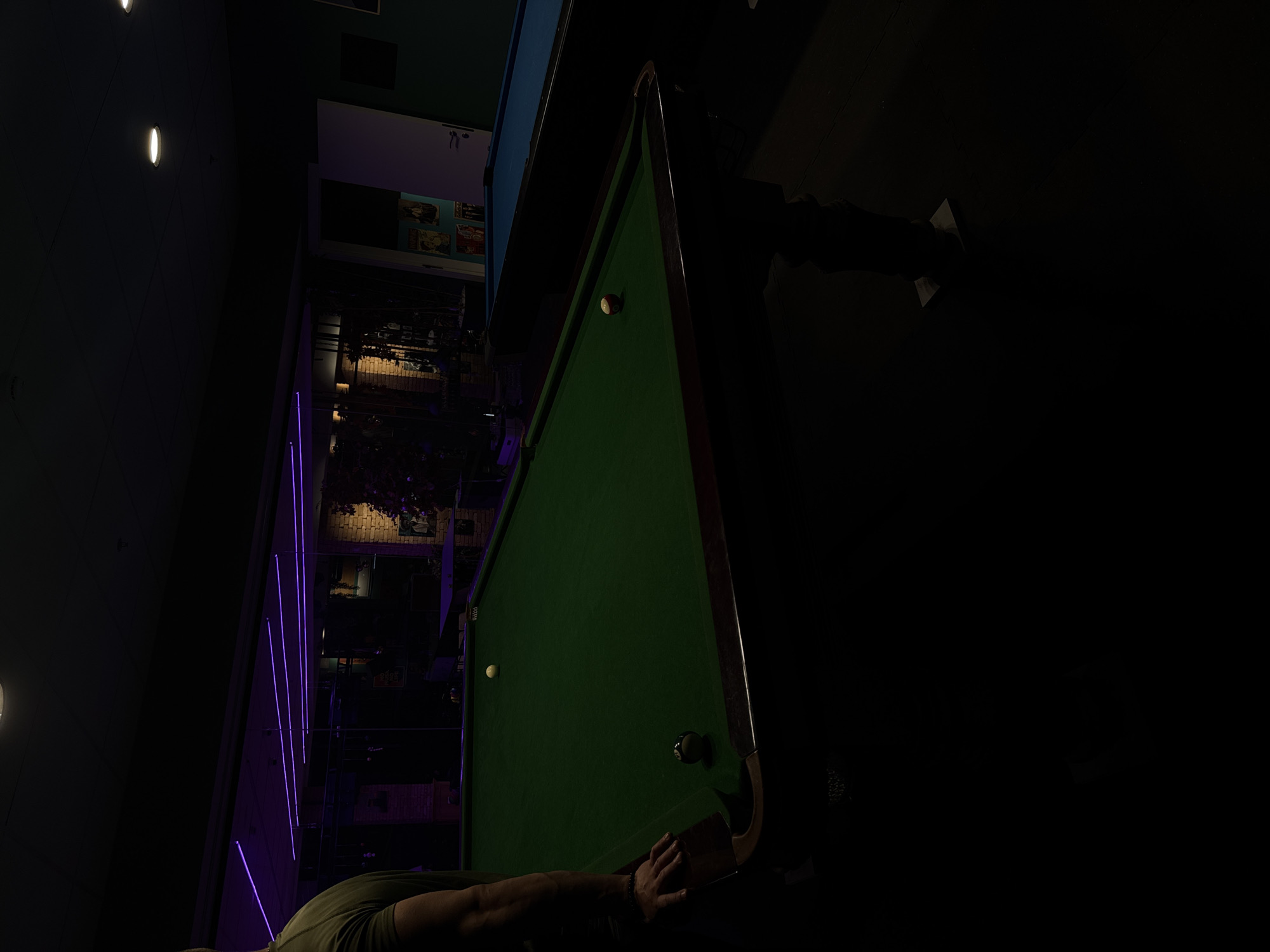 The image captures an indoor scene within a recreational establishment, identified as being in Majdal Shams, Israel. The foreground features the left side of a person, observed from the upper arm to the mid-thigh, wearing a dark olive green short-sleeved shirt. Their right forearm and hand, adorned with a dark bracelet, rest on the dark wooden rail of a billiard table. This table has a green felt surface, on which a black 8-ball is positioned near the foreground left pocket, and a solid white cue ball is located further up the table, closer to the center. In the mid-ground, to the right, a second billiard table with a blue felt surface is partially visible. The background is dimly lit, showcasing sections of an exposed brick wall, horizontal purple LED strip lighting on what appears to be a reflective or mirrored surface, and an open white door with various posters affixed to the adjacent wall. Overhead, multiple circular spotlights are visible, contributing to the establishment's illumination.