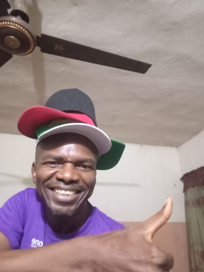 A smiling man wears three hats stacked on his head. The hats are green, white, red, and black. He wears a purple t-shirt and gives a thumbs-up. A ceiling fan with a light fixture is visible above him. A wall with a partially visible window and curtain forms the background. The room has a simple, domestic interior.