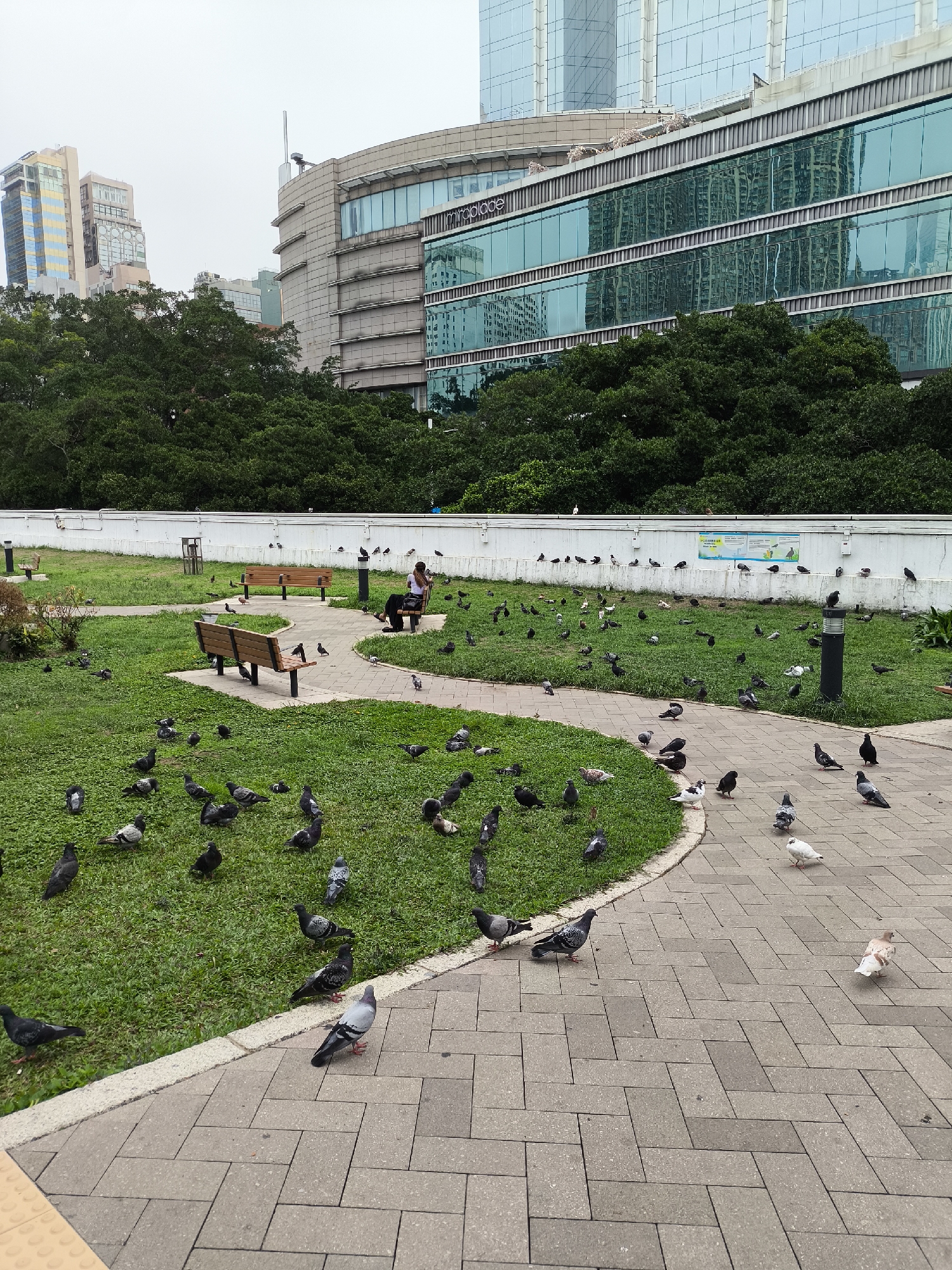 The image captures a scene in a park located in Hong Kong, China, characterized by an abundance of pigeons. The park consists of grassy areas interspersed with paved walkways. A series of benches are placed along the walkways, with a person seated on one of them. The person appears to be interacting with the pigeons. A low white wall runs along the back of the park, behind which is dense green foliage and tall buildings. The architecture is modern and urban, reflecting the city's landscape. The overcast sky suggests a cloudy day. The pigeons are scattered throughout the park, both on the grass and the walkways.