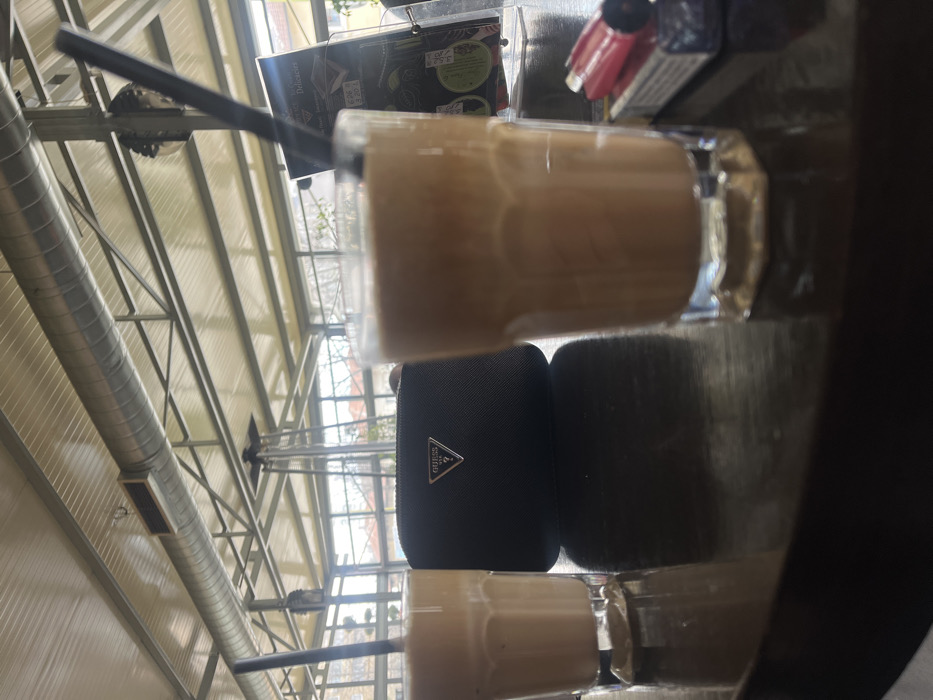 The image depicts a close-up, eye-level view of a dark, reflective table surface within an enclosed cafe or bar structure in Gabrovo, Bulgaria. Two clear glasses, each containing a light brown, frothy beverage and a black plastic straw, are positioned on the table. Between the glasses rests a black, textured pouch or small bag featuring a silver-colored triangular "GUESS USA" logo on its front. To the right of the rightmost beverage glass, a red disposable lighter lies on top of a partially visible pack of cigarettes. A menu stand with a predominantly green-themed menu is discernible behind the right glass. The background reveals an indoor ceiling structure composed of light-colored corrugated panels supported by metal beams and trusses, with a prominent, exposed silver-colored HVAC duct running horizontally. Several suspended light fixtures or heaters are also visible. Beyond the internal structure, through blurred glass windows, an outdoor environment with bare trees and distant buildings is apparent. No individuals are clearly identifiable within the frame.