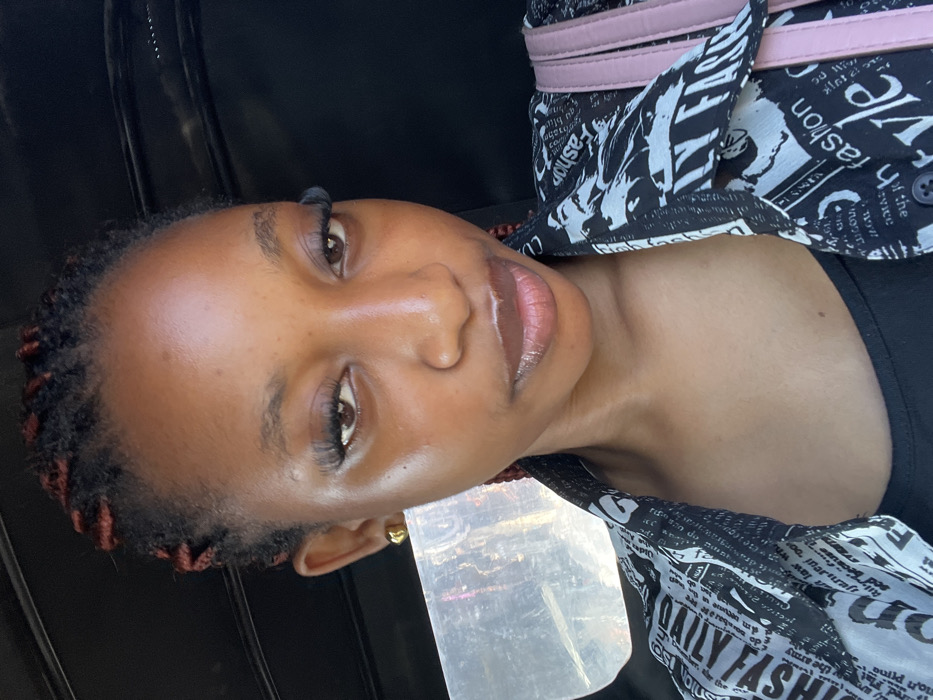 The image captures a close-up, eye-level selfie of a single female individual, stated to be in the city of Ado, Nigeria. Her head and upper torso are visible, with dark skin tone. She has dark, reddish-brown braided hair styled in cornrows or twists. Her facial features include dark brown eyes adorned with prominent false eyelashes, and full, glossy lips that appear slightly parted. A small, rounded golden stud earring is visible in her left ear. She is wearing a black undershirt beneath an open collared shirt featuring a black and white print resembling newspaper text, with words such as "DAILY FASHION" and "style" discernible. A pink strap, likely from a bag or backpack, is visible over her right shoulder. The background is dark and largely indistinct, suggesting an interior space, possibly a vehicle, with a reflective, lighter area on the left side, indicating a window or external light source. The individual gazes directly into the camera with a neutral expression.
