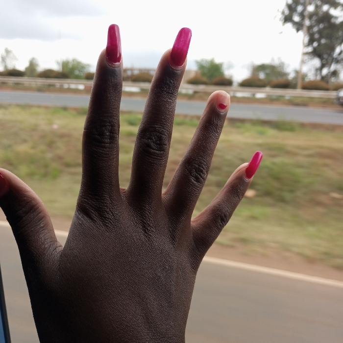 A person's dark-skinned hand with long, glossy, pink nails is held up against an outdoor backdrop