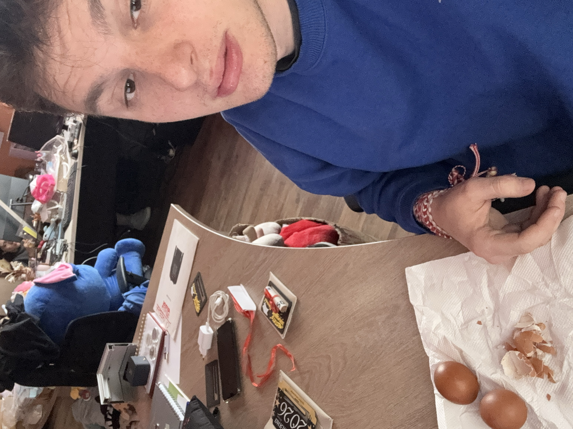 The image captures an indoor, well-lit office or shared workspace in Unknown, Bulgaria. In the immediate foreground, a male subject, appearing to be in his late teens or early twenties, with short, dark hair and light facial stubble, is positioned to the right, looking directly towards the camera in a selfie-style composition. He is wearing a blue crew-neck sweatshirt. A red and white woven bracelet is visible on his left wrist. To the left of the foreground subject, on a light-colored wooden desk surface, two intact brown chicken eggs and a cluster of light brown eggshell fragments rest upon a crumpled white paper towel. Further along the desk, a dark-colored smartphone is placed screen-down, adjacent to a white USB wall charger and a coiled white charging cable. A small white object adorned with a red ribbon and a small metallic bell is present, alongside a black rectangular item featuring yellow graphics. A spiral-bound notebook and a small book displaying "2026" and Cyrillic text (ДИПЛОМА) are also on the desk. In the mid-ground, at a separate workstation, a person is seated in a black office chair, wearing a full-body blue plush costume with pink ears, resembling the character Stitch. Their back is partially towards the camera. In the background, to the right, another individual with dark hair is visible from the side, seated at a desk with a computer monitor. The background environment shows additional cluttered desks with various electronic devices and personal items, indicative of an active workspace. The floor throughout the visible area is wooden.