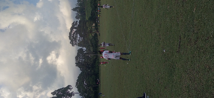 An outdoor scene shows a soccer game on a green field under a cloudy sky. Players in white and red uniforms are scattered across the field. Trees line the background, adding depth to the scene. The angle is slightly tilted, capturing the vastness of the field and the activity of the players. Some spectators are visible in the background.