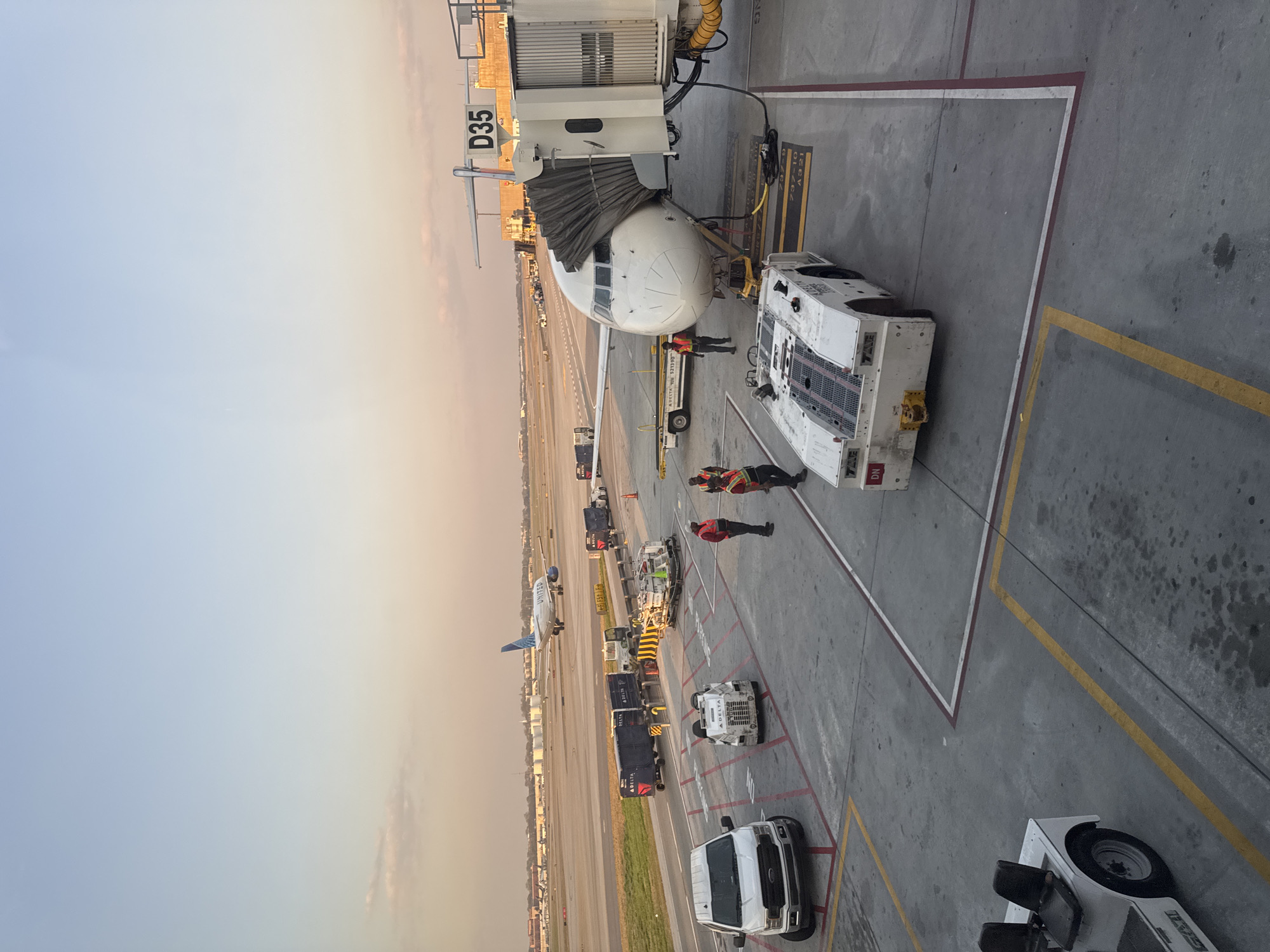 This image depicts an active airport apron at Hartsfield-Jackson Atlanta International Airport (ATL), in Atlanta, United States of America, during early morning or late afternoon light, indicated by the gradient orange and blue sky. In the foreground, a concrete tarmac features yellow and red directional markings. A white utility vehicle with two black seats is partially visible on the far left. A large, white Delta-branded pushback tug is positioned centrally on the tarmac. In the midground, a white Ford F-150 pickup truck is parked on the left. A white narrow-body aircraft, identifiable by "737-9 / A321" markings on the tarmac near its nose wheel, is parked at gate D35 and connected to a covered jet bridge. Multiple airport ground staff, wearing high-visibility orange vests over dark uniforms, are present near the aircraft and ground support equipment. One individual stands near the nose gear, another near the main cabin door area of the aircraft, and two more are observed near the pushback tug. Other ground support vehicles, including baggage carts marked "DELTA," a cargo loader, and a yellow tug, are positioned further left on the apron. In the background, an active runway or taxiway is visible, where a United Airlines aircraft, likely an Airbus A320 family member, is taxiing. Distant airport structures, including buildings and fuel storage tanks, are visible under a clear horizon.