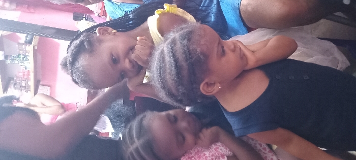 Three young children are clustered together. One child with braided hair and a yellow top looks at the camera. Another child rests their face on their hand, gazing to the side, while wearing a dark blue shirt. The third child, dressed in a pink and white patterned dress, appears to be sleeping. The children are close, possibly siblings or friends, in an indoor setting.