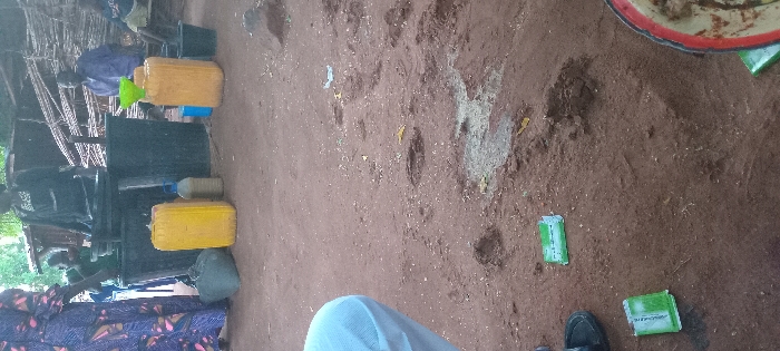 An outdoor scene features yellow jerrycans next to a black container near a shelter-like structure. The ground is brown with scattered debris, including two green wrappers. A person wearing a patterned dress stands nearby, and another person in light blue trousers is partially visible. A large bowl is seen at the top right corner.