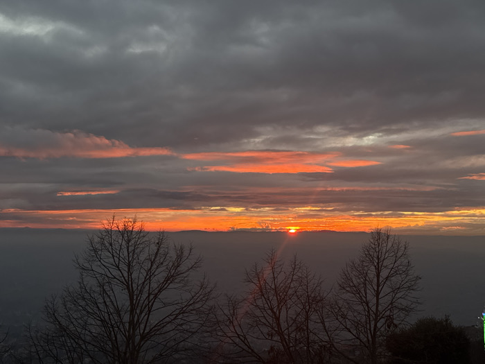 An expansive vista showcases a vibrant sunset sky. Clouds, predominantly gray and heavy, are streaked with bands of orange and red, particularly near the horizon. Silhouetted leafless trees occupy the foreground, their bare branches contrasting with the colorful sky. The sun peeks through a gap in the clouds, casting a warm glow over the landscape. The scene evokes a sense of tranquility and the beauty of nature's display.