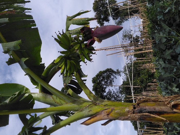 The scene depicts an agricultural area in Phouviang-Gnai, Laos, under a partly cloudy sky. A substantial banana plant dominates the left and central foreground, exhibiting a robust, multi-toned greenish-brown pseudostem and large, broad green leaves, several of which display signs of fraying or tearing. A cluster of green, unripe bananas hangs centrally from the plant, directly above a prominent, elongated, reddish-purple banana blossom. In the mid-ground, a cultivated field contains numerous low-growing green leafy plants, arranged in discernible rows. Numerous slender, light-colored vertical stakes, consistent with bamboo or similar wood, are visible throughout this field. The background consists of a dense arrangement of dark green trees, with several taller trees silhouetted against the sky. No human subjects or discernible actions are present within the frame.