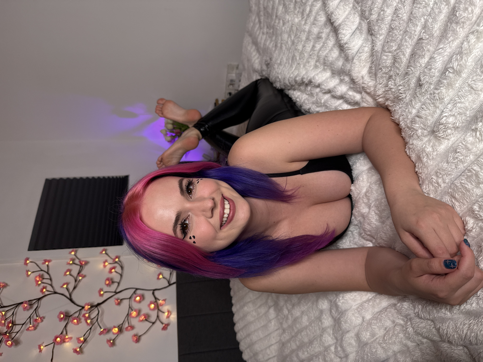 A woman lies on a bed with a white, textured duvet. She has pink and blue hair and is wearing black clothing, possibly a tank top and leggings. Her feet are visible near a bedside table with a vase of flowers, illuminated by a purple light. Her head is near a wall decorated with a cherry blossom branch light feature and a black acoustic panel. The image is rotated. The location cannot be determined as being in the City of Zagreb, Croatia, as there are no discernible clues to place it there.
