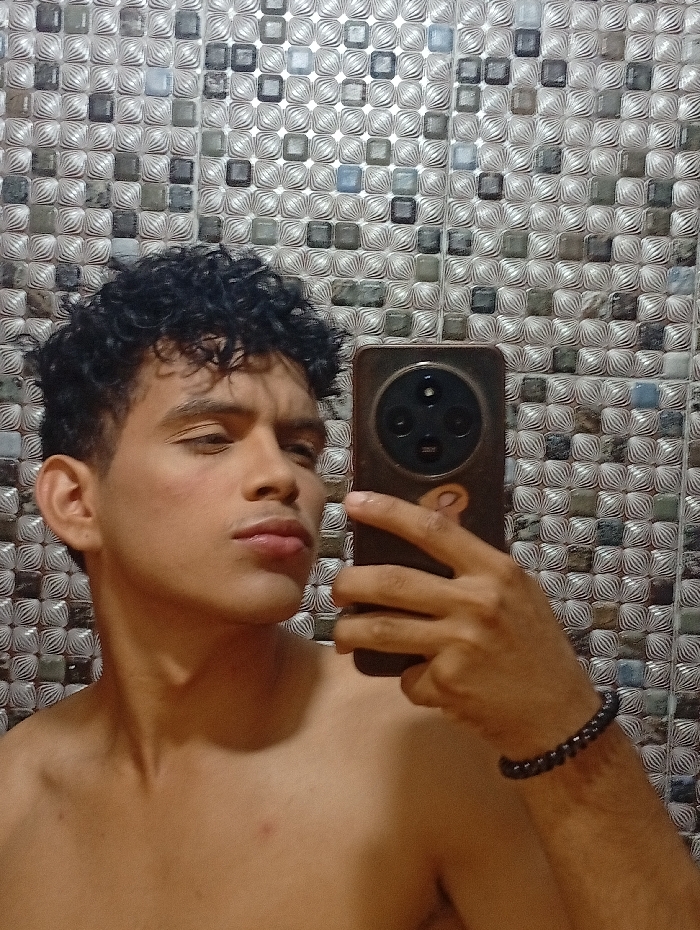 A shirtless person with curly hair is taking a selfie with a mobile phone. The phone has a distinctive camera setup with three large lenses. The person is wearing a beaded bracelet on their right wrist. The background is a wall covered in patterned tiles with a mix of light and dark shades. The person has a neutral expression and is holding the phone up to their face.