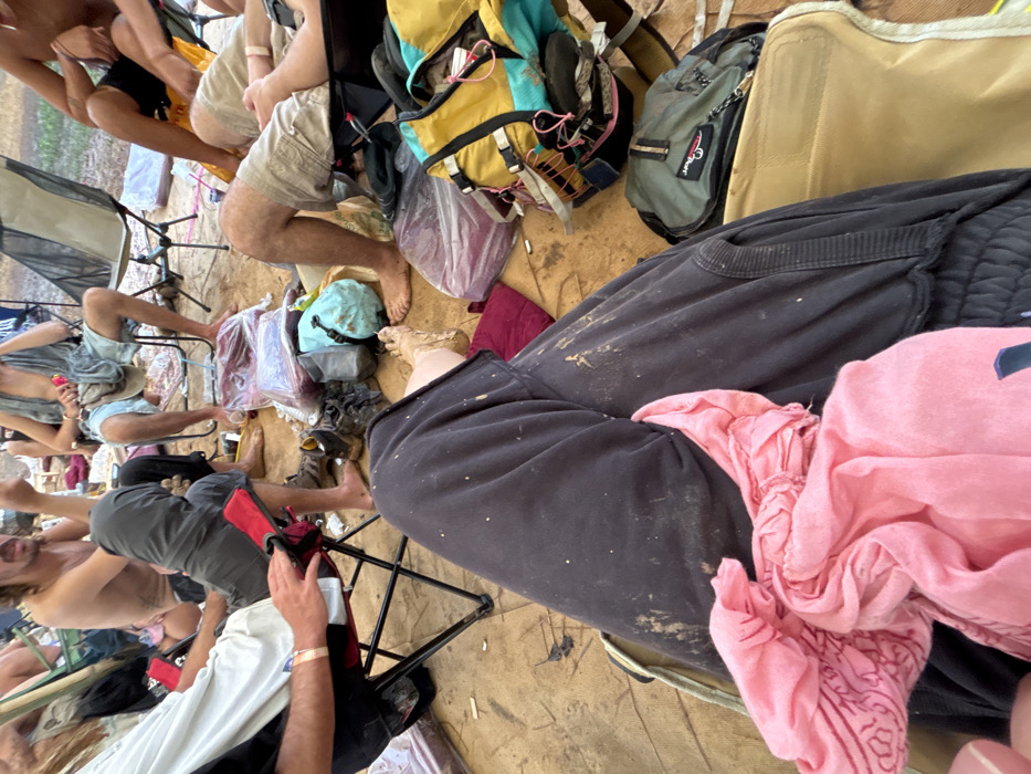 The image depicts a group of people sitting in chairs outdoors. There are backpacks and various items scattered on the ground, giving the impression of a campsite or outdoor event. The legs and feet of multiple individuals are visible, some covered in mud. One person in the foreground is wearing dark sweatpants with mud splattered on them and a pink cloth draped over their lap. The setting appears relaxed and communal.