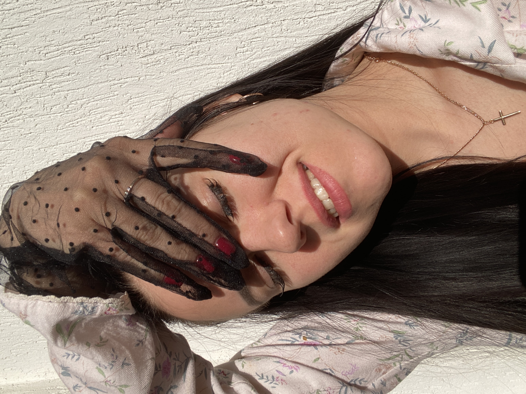 A woman with long, dark hair and fair skin lies on a white surface, possibly a wall or floor, partially obscured by shadow. She is wearing a light-colored, floral-patterned shirt. Her left hand, adorned with a black, polka-dot mesh glove and a ring, covers part of her face. Her fingernails are painted red. A gold necklace with a cross pendant is visible around her neck. She is smiling, with her eyes partially closed. The background is a textured white surface. There is no specific information to indicate that this image was taken in Chaikovsky, Russia.