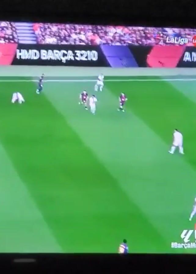 A television screen shows a soccer match in progress. The score is tied at 0-0. Players in white and blue jerseys are spread across the green field. The TV display indicates that the game is live. The stadium is filled with spectators. The screen also displays "LaLiga Live" and "#BarçaMallorca".