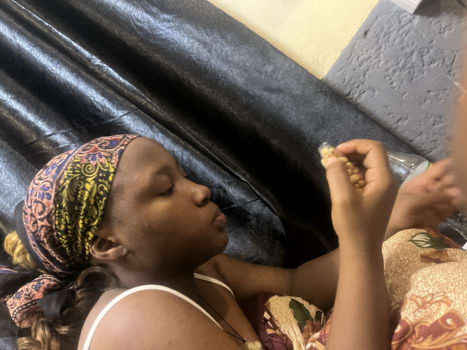 A person wearing a colorful headscarf rests against a dark, textured surface, possibly a couch or headboard. Their eyes are closed, and they are holding a small bottle filled with what appear to be chickpeas. The person is wearing a white top, and a patterned blanket or sheet is draped over their lap. A hand can be seen off to the right side holding a bottle, possibly passing it to the subject. The background behind the couch is beige and gray.