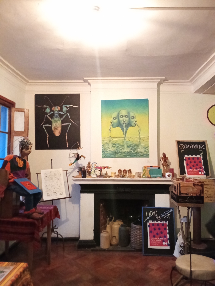 This image depicts an interior view of an art or cultural space identified as Casa la Raíz, located in Santiago, Chile