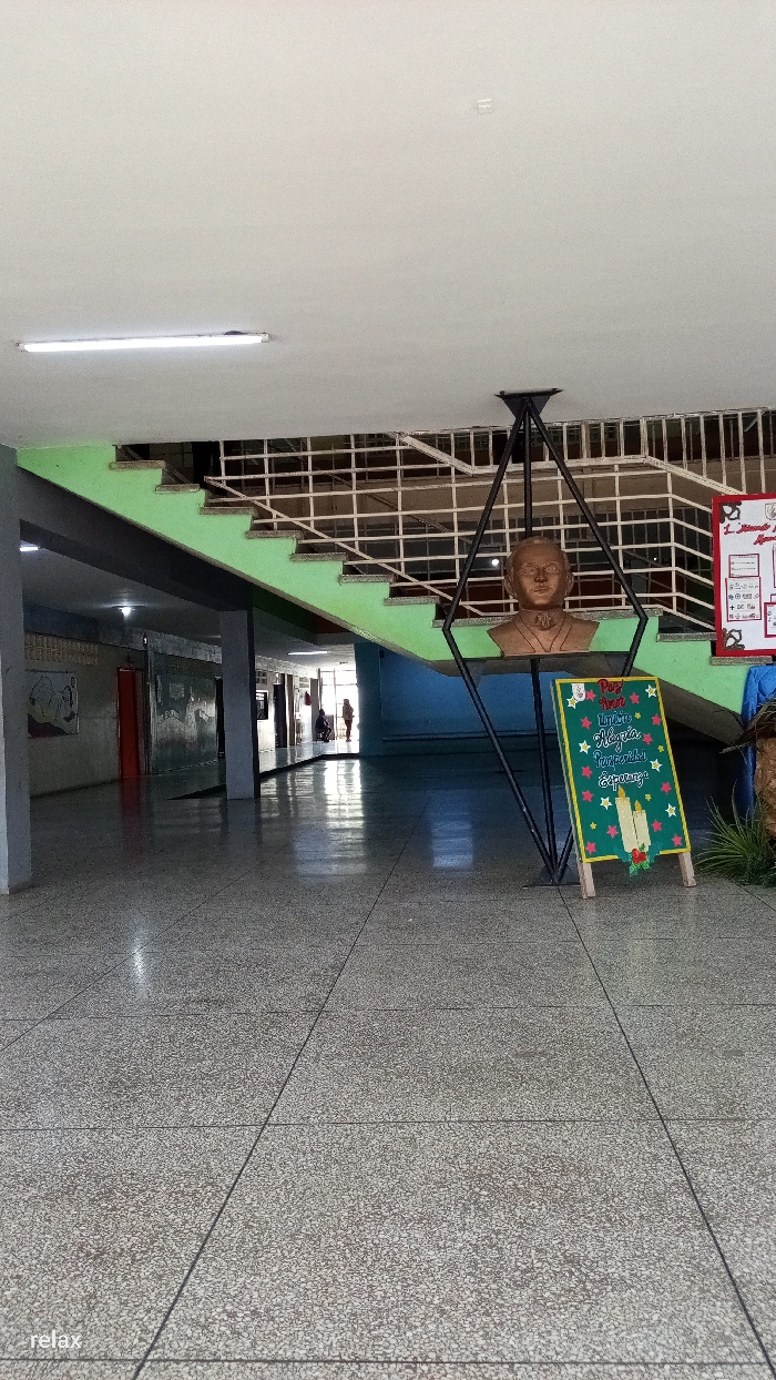 The image presents an interior view of a public building in Santa Ana, Venezuela. The floor is composed of light grey terrazzo tiles segmented into rectangular patterns by dark grout lines. In the midground, a bronze-colored bust of a male figure is centrally positioned within a large, black, open diamond-shaped metal frame. The bust depicts an adult male wearing a formal collar. To the immediate right of the bust, a green A-frame sign, resembling a blackboard, stands on a light-colored wooden easel. This sign is decorated with colorful stars, two white candles with red bases and green holly, and Spanish text that reads "Paz, Unión, Alegría, Esperanza" (Peace, Union, Joy, Hope). Behind these items, a staircase with green risers and light-colored treads ascends towards the upper left portion of the image. A white metal railing with a grid-like pattern borders the staircase. A long, tiled corridor extends into the background. The left wall of the corridor is dark, displaying indistinct framed artwork and a prominent red door further down. The right wall of the corridor is painted a muted blue. At the far end of the corridor, three indistinct human figures are visible in a brightly lit area, suggesting an exit or another open space beyond; two figures appear stationary while one is positioned further back. The ceiling is white and features a long, exposed fluorescent tube light fixture on the left side, with another smaller, square light fixture visible deeper in the corridor. A dark grey structural column is visible on the left, supporting the overhead structure. A "relax" watermark is visible in the lower-left corner of the image.