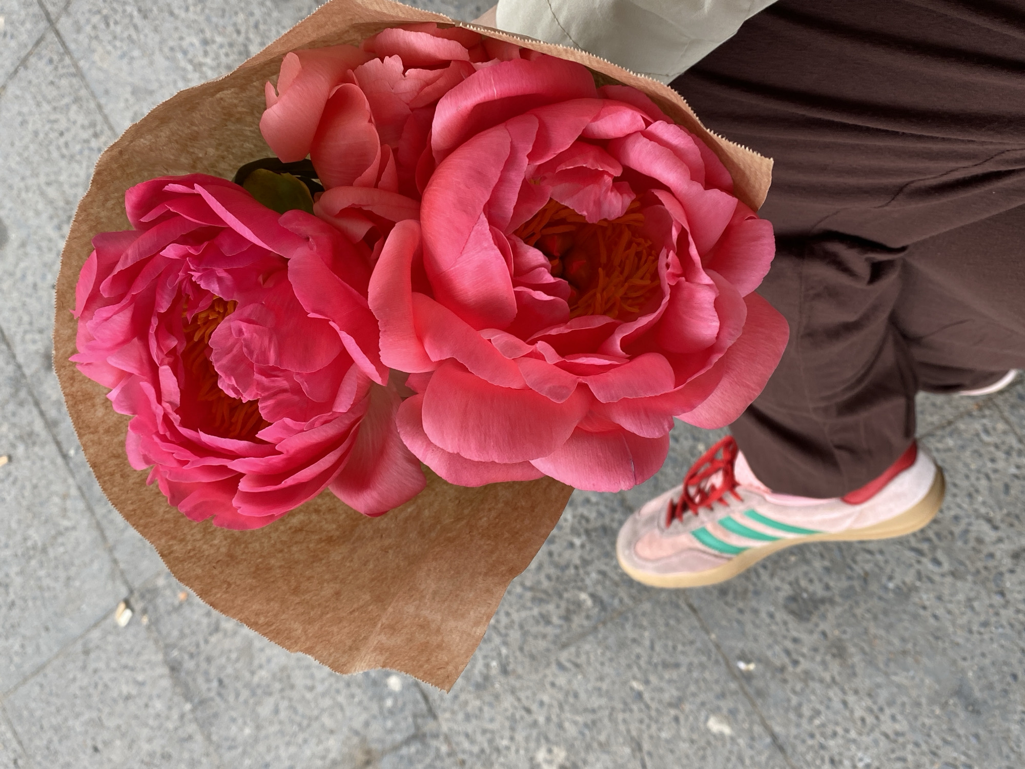 A high-angle, eye-level shot depicts three pink peonies arranged in a brown paper wrapping, seemingly held by a person wearing brown trousers. A portion of the person's foot, shod in a pink sneaker with green stripes and red laces, is visible. The setting appears to be an urban area, judging by the gray paved ground visible in the lower portion of the frame. Given the person's attire and the presence of peonies in a paper wrap, the scene may be taking place in the city of Berlin, Germany.