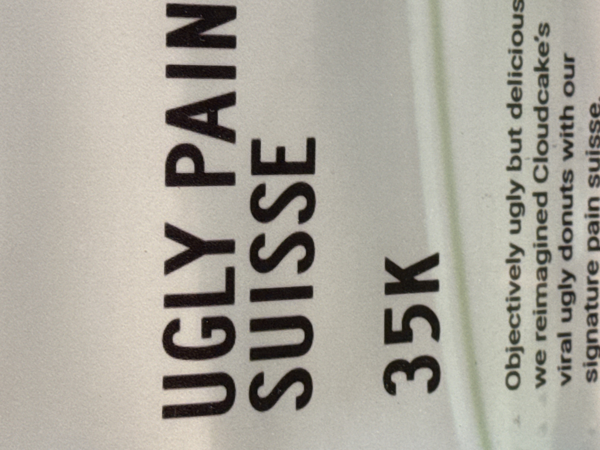 The image displays text. From left to right, the stacked words "UGLY PAIN" and "SUISSE" are printed in large, bold, black font. Adjacent to "SUISSE," the text "35K" is printed in the same font style and color. To the right of "35K," smaller text reads "Objectively ugly but delicious we reimagined Cloudcake's viral ugly donuts with our signature pain suisse." It is a close-up shot and the background appears to be white. There is no contextual information visible in the image to confirm the location in North Kuta, Indonesia.