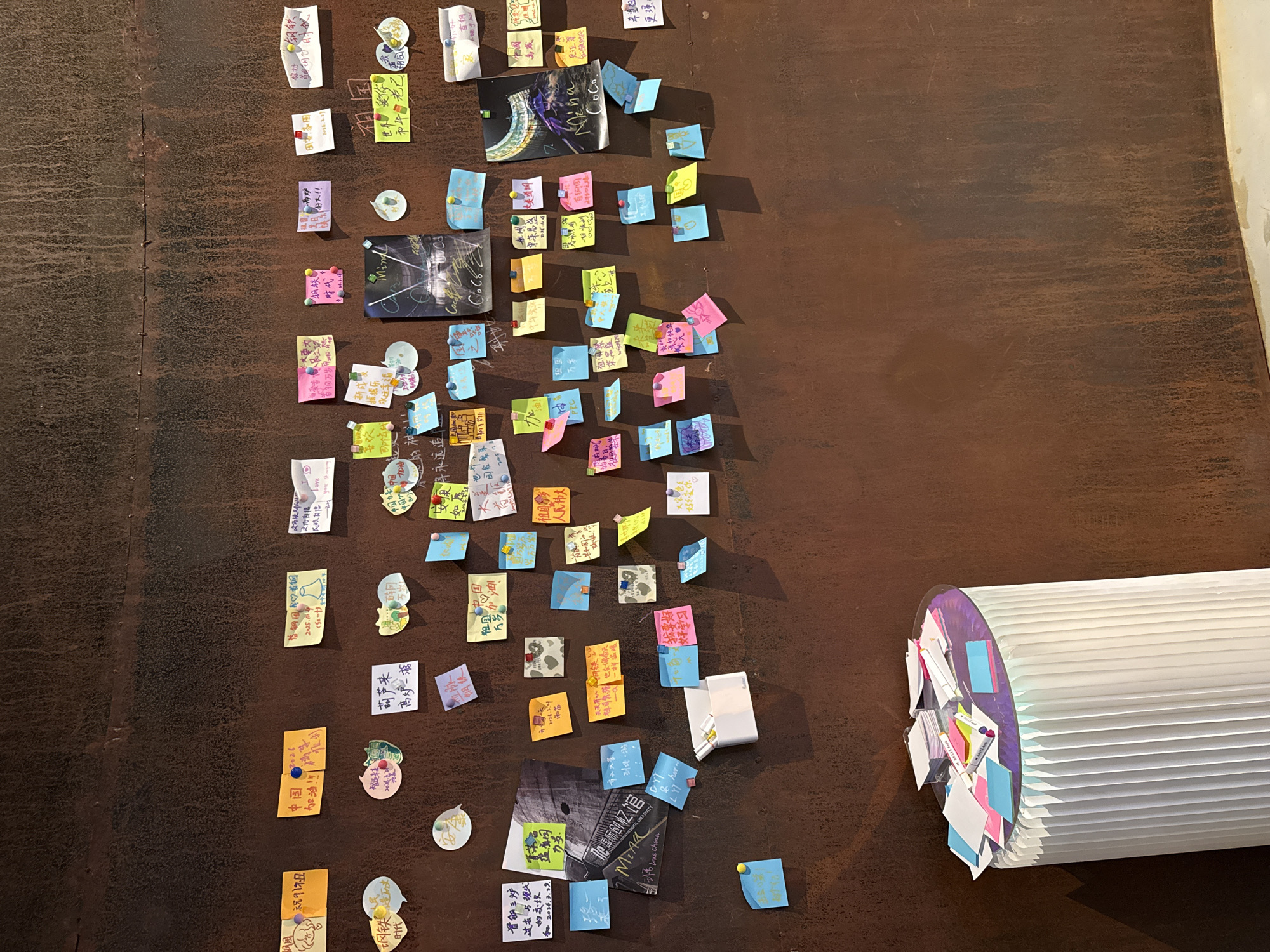 This image shows a wall in Shijingshan District, China, covered in pinned notes and photographs