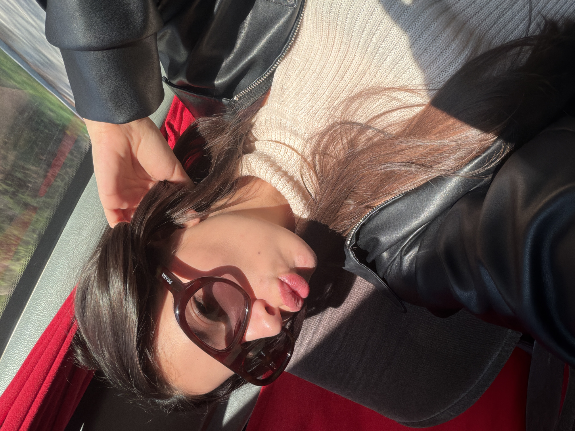 A woman is pictured in a medium shot. She wears sunglasses marked "PRADA," a cream-colored sweater, and a black leather jacket. A hand is near her head. She is positioned near a window, which suggests an indoor location, possibly in transit. Red fabric is also visible, which may be part of the interior of the transit vehicle. The location within Dolno Osenovo, Bulgaria, cannot be determined with the current information.