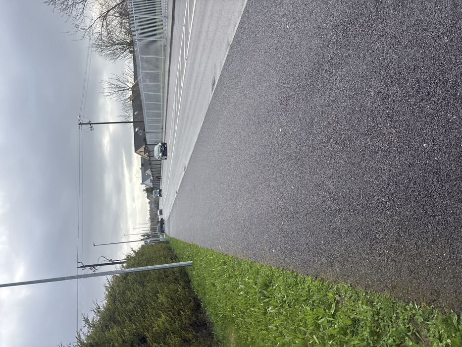 The image depicts an outdoor scene on the R555 (Tralee Road) in Listowel, County Kerry, Ireland, looking north towards the town center. The environment is characterized by an overcast sky and diffuse lighting, suggesting a cloudy day. In the immediate foreground on the left, a strip of vibrant green grass, approximately one meter wide, runs parallel to a dark grey asphalt path. This path, which appears to be a shared pedestrian and cycleway, extends from the bottom of the frame into the distant background. To the left of the path, a dense, dark green hedge forms a continuous barrier, receding into the distance. A tall, slender grey utility pole with overhead power lines stands vertically near the hedge in the mid-ground. Further along this side, additional streetlights are visible. To the right of the path, a two-lane asphalt road is present. The road surface appears damp and features white lane markings, including broken white lines for separation and several rectangular white markings in the nearer lane, possibly delineating specific road sections or a stopping area. Along the right side of the road, a tall, white metal fence composed of vertical bars stretches into the background. Behind this fence, several residential-style buildings with dark, pitched roofs and light-colored walls are visible, interspersed with bare deciduous trees, consistent with the grounds of the Listowel Community Hospital. Multiple vehicles are observed traveling on the road, moving away from the viewer. These include a dark-colored car in the closest lane on the right, a white van, and several other dark sedans further down the road. No individuals are visible in the scene. The overall impression is that of a functional urban fringe road during daytime.