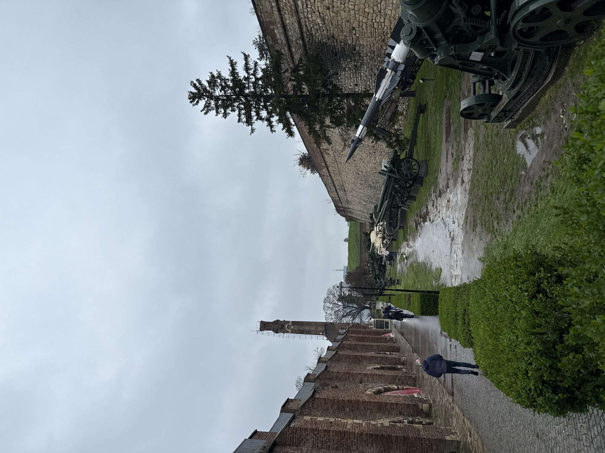 The image depicts an outdoor military exhibit at Kalemegdan Fortress in Belgrade, Serbia, under an overcast sky. A cobblestone path runs from the foreground to the background along the left side, bordered by a reddish-brown brick wall featuring arched openings. To the right of the path, a manicured green hedge separates the walkway from a grassy area that displays military hardware. This grassy area contains mud puddles and wet patches, indicating recent rainfall. Displayed on the grass are several large, dark green artillery pieces. A prominent black and white missile is mounted on a launch platform, angled upwards, in the mid-ground on the right. Further back on the right, a light-colored stone wall forms a boundary, with a tall conifer tree positioned in front of it. In the distance, to the left, a tall, slender brick tower with an external ladder is visible. Approximately five individuals are present on the cobblestone path. One man, wearing a dark blue jacket and jeans, walks away from the camera in the foreground-midground. Two other individuals are visible further down the path, also walking away. Two additional figures are partially obscured in the distant background near another armored vehicle or exhibit.